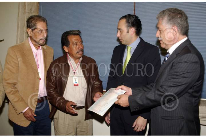 MÉXICO, D.F., 06AGOSTO2010.- Roberto Gil Zuarth, subsecretario de Gobierno de la Secretaría de Gobernación y Tomás Ríos Bernal, subsecretario de Ordenamiento de la Propiedad Rural de la Secretaría de la Reforma Agraria, entregaron al movimiento de los 400 Pueblos, encabezado por César del Ángel, la cantidad de 15 millones de pesos, los cuales destinarán para la compra de 300 hectáreas en el estado de Veracruz y que beneficiaran a 73 familias campesinas miembros de esa organización. FOTO: CUARTOSCURO.COM