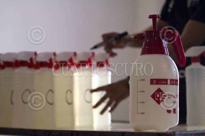 GUADALUPE, NUEVO LEÓN, 18MARZO2020.- Voluntarios realizan envasado de gel antibacterial y cloro que será repartido entre la ciudadanía de manera gratuita ante el incremento de casos de coronavirus en Nuevo León. FOTO: GABRIELA PÉREZ MONTIEL / CUARTOSCURO.COM