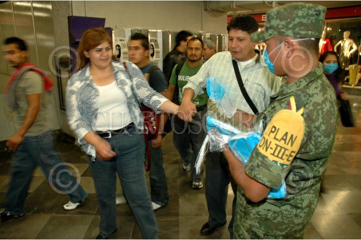MÉXICO D.F., 24ABRIL2009.- Elementos del ejercito mexicano del Plan DN - III regalan cubrebocas a las personas que ingresan al Metro, esto para evitar propagar la epidemia de influenza. FOTO: RODOLFO ANGULO/CUARTOSCURO.COM
