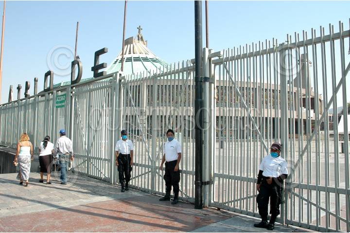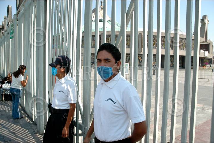MÉXICO D.F., 26ABRIL2009.- Elementos de seguridad con cubre bocas hacen guardia a las afueras de la Basilica de Gudalupe que se encuentra cerrada en sus accesos principales debido a la epidema de influenza porcina. FOTO: RODOLFO ANGULO/CUARTOSCURO.COM
