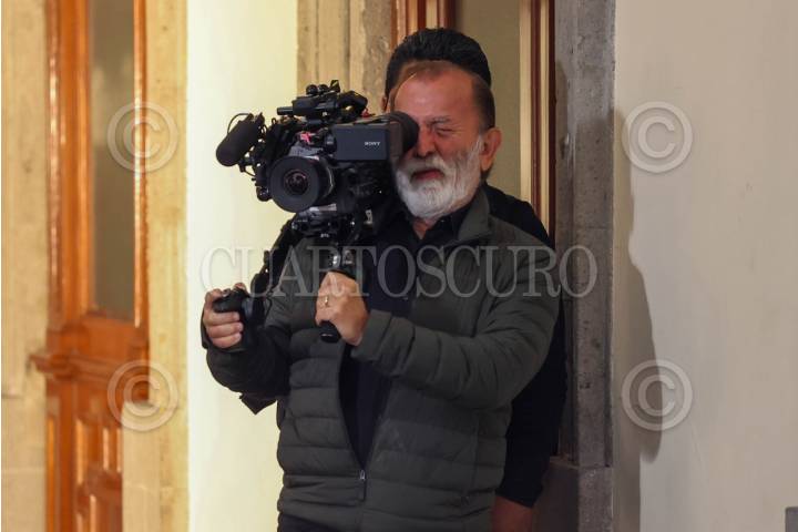 CIUDAD DE MÉXICO, 25AGOSTO2025.- El productor y camarógrafo Epigmenio Ibarra graba aspectos de la Mañanera del Pueblo, la cual fue encabezada por Claudia Sheinbaum Pardo, en Palacio Nacional. FOTO: MOISÉS PABLO/CUARTOSCURO.COM