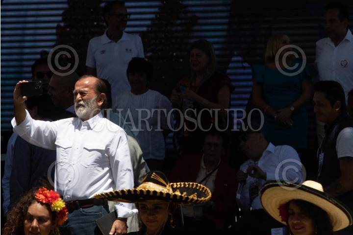 CIUDAD DE MÉXICO, 10SEPTIEMBRE2023.- El productor Epigmenio Ibarra graba con su celular durante el 5 Informe de Gobierno de Clara Brugada, en el Deportivo de Santa Cruz Meyehualco. FOTO: MOISÉS PABLO/CUARTOSCURO.COM