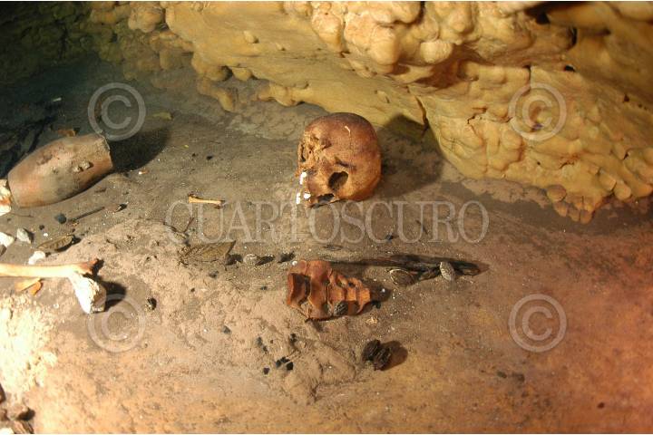 CHICHÉN ITZA, YUCATÁN, 24MAYO2011.- Arqueólogos subacuáticos descubrieron dentro de un cenote cercano a la pirámide El Castillo, en Chichén Itzá, Yucatán, una ofrenda mortuoria depositada en la época prehispánica dentro de un nicho natural sumergido en las paredes de la roca, durante un ritual de petición de lluvia que debió celebrarse en los siglos IX y X, cuando los antiguos mayas padecieron dos periodos de sequía en la región. FOTO: INAH/CUARTOSCURO.COM