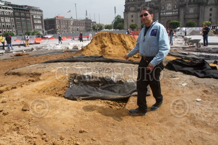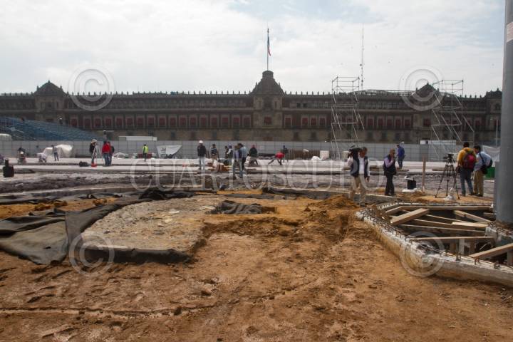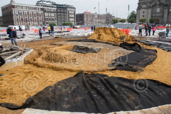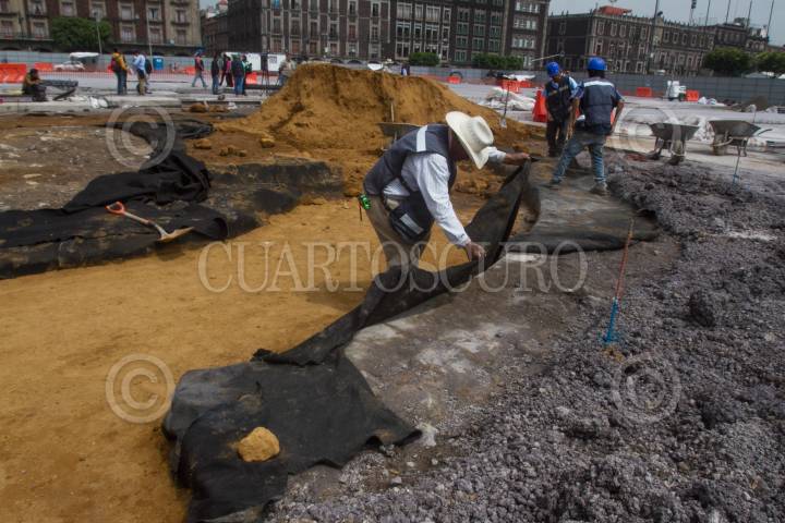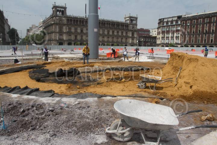CIUDAD DE MÉXICO, 06JULIO2017.- Durante los trabajos de remozamiento del Zócalo capitalino se encontró una plataforma circular que data de 1843, proyectada por el presidente Antonio López de Santa Anna y que sería un monumento a la Independencia, el cual tendría esculturas de los héroes de esa batalla, y dentro del basamento los restos de sus cuerpos. El descubrimiento estuvo a cargo de Alejandro Meraz Moreno, director del salvamento del Instituto Nacional de Antropología e Historia. Esta pieza histórica quedará nuevamente enterrada este fin de semana, según lo informó la Secretaría de Obras y Servicios (Sobse). La pieza será protegida por una capa de tierra previó al colado definitivo. FOTO: MOISÉS PABLO /CUARTOSCURO.COM