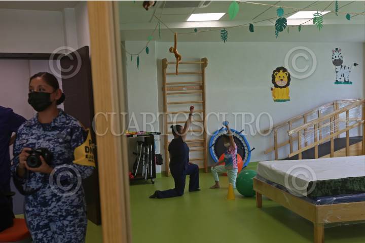Personal del Centro de Rehabilitación Infantil y Equinoterapia para hijos y familiares de militares del Ejercito Mexicano, atiende a una pequeña en su rehabilitación.