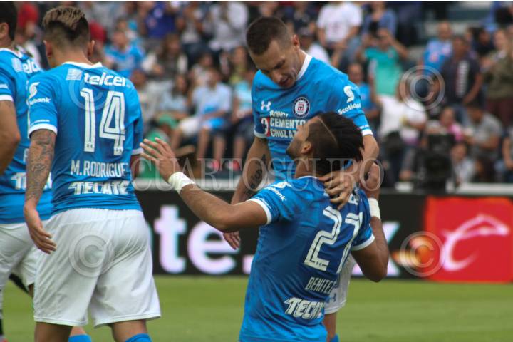 CIUDAD DE MÉXICO, 08ABRIL2017.- Jorge Benitez y Cristian el Cacho Jimenez, festejan el gol del Cruz Azul que empato 1-1 con los monarcas del Morelia, en cel estadio Azul como parte de la jornada 13 del torneo Clausura 2017 de la liga MX. FOTO: ANTONIO CRUZ /CUARTOSCURO.COM
