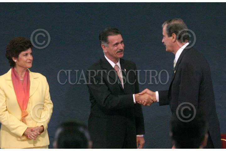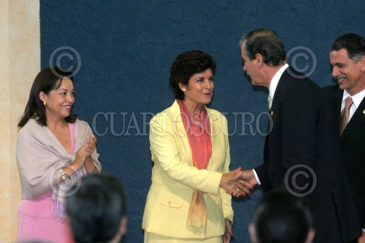 MEXICO, D.F., 11AGOSTO2005.- Guadalupe Morfín, Comisionada de Coordinación y Enlace para Prevenir y Erradicar la Violencia Contra las Mujeres en Ciudad Juárez, Vicente Fox Quesada, Presidente de la República y Carlos Abascal, Secretario de Gobernación, durante el 2 Informe de Gestión de la Comisión Para Juárez de la Secretaría de Gobernación. FOTO: Moisés Pablo/CUARTOSCURO.COM