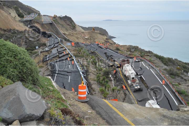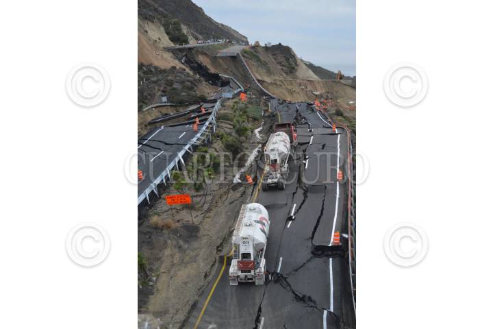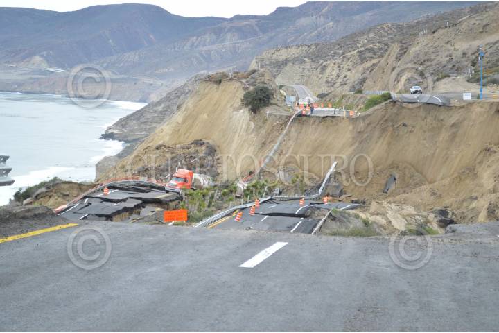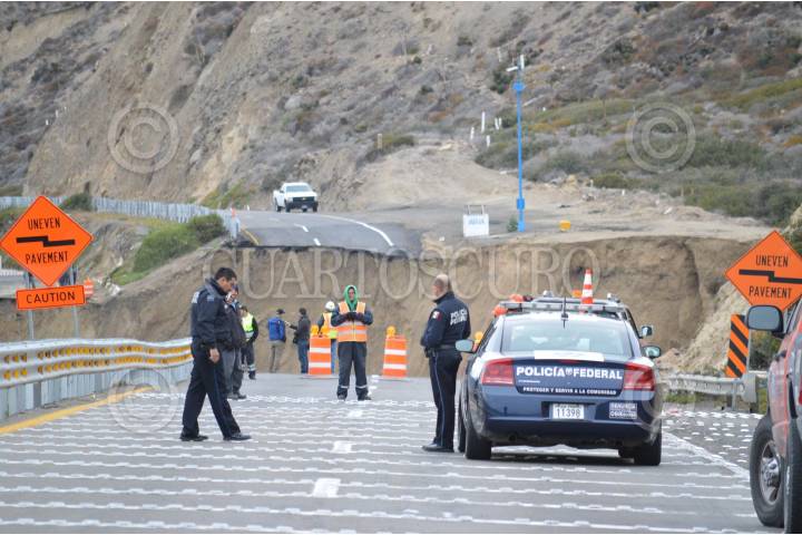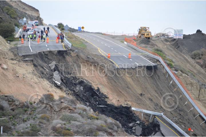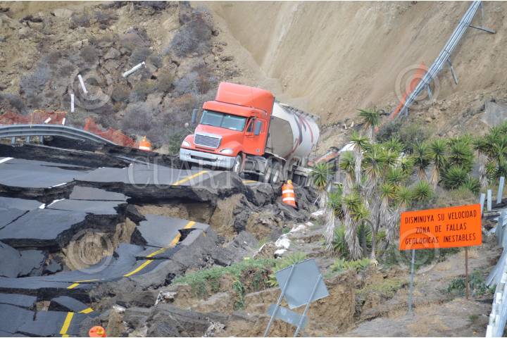 TIJUANA, BAJA CALIFORNIA, 29DICIEMBRE2013.- Un hundimiento de 30 centímetros en la carretera Escénica Ensenada-Tijuana se convirtió en el desplome de hasta 40 metros a lo largo de un tramo de 300 metros a la altura del kilómetro 93, un daño atribuible a la falla de San Andrés, y que tardará al menos un año en ser reparado. El hundimiento inició con un desnivel de apenas 30 centímetros desde el pasado 26 de diciembre, mismo que se convirtió en un colapso de 40 metros, dejando atrapados varios tráileres de carga que circulaban en ese momentos; asimismo, quedó incomunicada no sólo Ensenada sino al resto de Baja California, ya que se trata de la autopista federal Transpeninsular que llega hasta Cabo San Lucas luego de un recorrido de mil 711 kilómetros. FOTO: JUAN MANUEL FELIX AMARILLAS /EL MEXICANO /CUARTOSCURO.COM