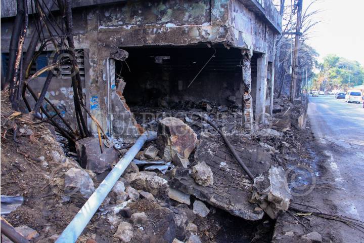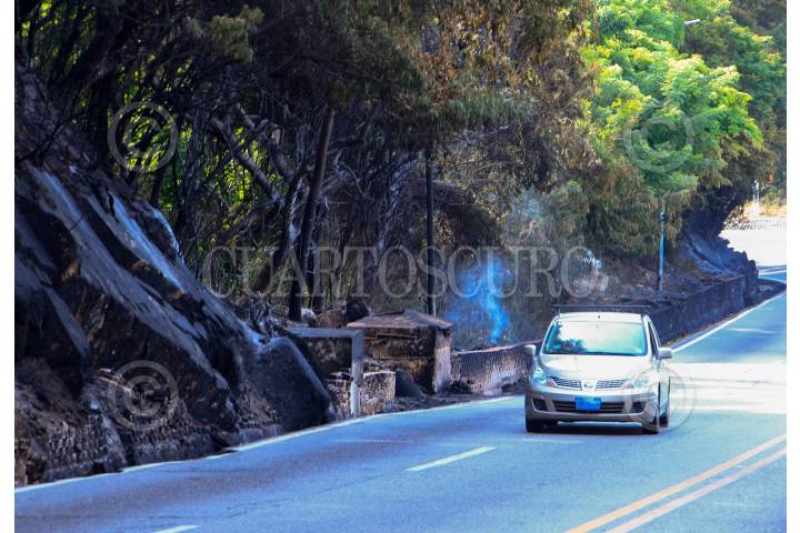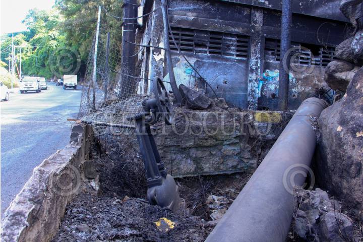 Vegetación quemada y un tanque de almacenamiento de agua inservible se observan como parte de las afectaciones de la explosión de una pipa del día de ayer en la avenida Escénica.
