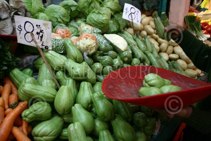 MÉXICO, D.F., 03ENERO2009.- Después de la celebbración de las fiestas de fin de año los capitalinos intentan buscar en el mercado los mejores precios de las verduras y legumbres y aunque se había señalado que no se subirían los precios de estas, en su mayoría han tenido un incremento esto por el aumento de las combustibles. En la imagen se aprecia que tanto como el chayote sin espina y la calabacita esta a 8 pesos el kilo. FOTO: MOISÉS PABLO/CUARTOSCURO.COM