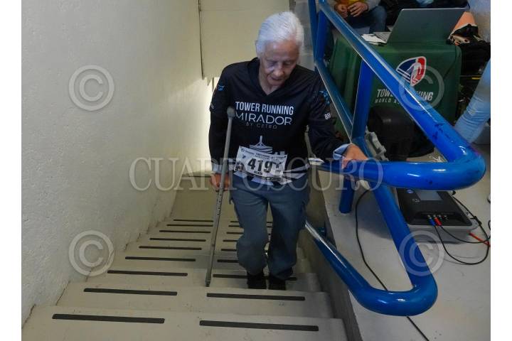 CIUDAD DE MÉXICO, 15DICIEMBRE2024.- Una mujer de la tercera edad, en sllegada a la meta en la edición 2024 de la "Carrera Vertical" que se realiza en el World Trade Center; Los participantes subieron 42 pisos que equivalen a 868 escaleras.FOTO: MAGDALENA MONTIEL/CUARTOSCURO.COM