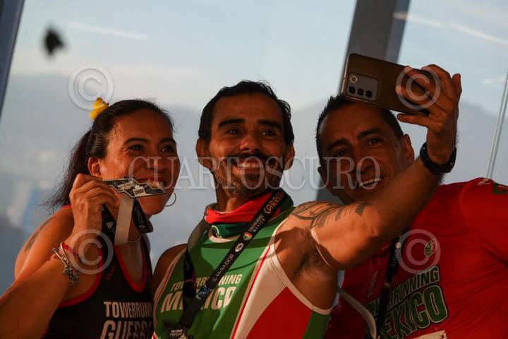 CIUDAD DE MÉXICO, 15DICIEMBRE2024.- Corredores se toman una fotografía al concluir con su participación en la "Carrera Vertical" edición 2024, en el World Trade Center; Los participantes subieron 42 pisos que equivalen a 868 escaleras.FOTO: MAGDALENA MONTIEL/CUARTOSCURO.COM