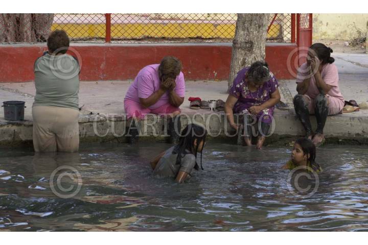 ESPINAZO, NUEVO LEON, 20SEPTIEMBRE2004.-FOTOHISTORIA.NIÑO FIDENCIO. Junto a un árbol "El charco" con tierra de la zona, recibe a los files seguidores del Niño Fidencio que se bañan y se llenan de lodo para curar sus enfermedades, algunos se toman el agua porque “es milagrosa y nos alivia, no le tenemos asco“ señalan. FOTO: Pedro Valtierra/CUARTOSCURO.COM