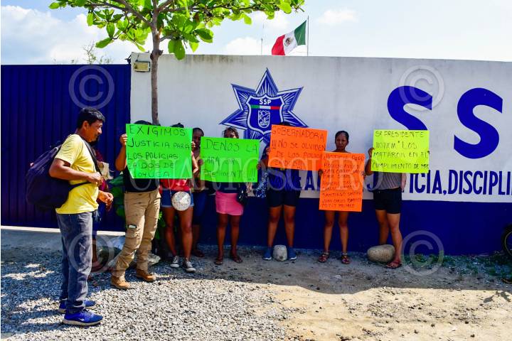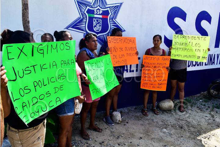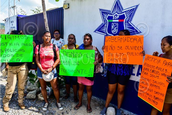 COYUCA DE BENITEZ, GUERRERO. 16NOVIEMBRE2023. - Las viudas y familiares de los 11 policías asesinados el 23 de octubre en la comunidad de El Papayo en Coyuca de Benítez , se manifestaron en el cuartel de la policía en ése municipio, para denunciar que el presidente municipal, Osiel Pacheco Salas, se ha negado en pagar una indemnización justa por la muerte de los policías, los policías no contaban con un seguro de vida, también pidieron también la intervención de la gobernadora del estado, Evelyn Salgado Pineda, para resolver este problema. FOTO: CARLOS CARBAJAL/CUARTOSCURO.COM