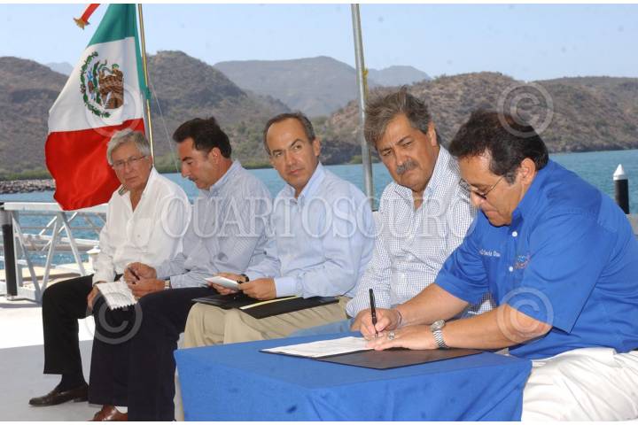 LORETO, BAJA CALIFORNIA SUR, 19ABRIL2007.- El presidente Felipe Claderón acompañado del gobernador Leonel Efraín Cota, durante la presentación del proyecto Puerto Escondido y frimo el convenio de de donación de la planta de Aguas Reciduales. FOTO: ALFREDO GUERRERO/CUARTOSCURO.COM