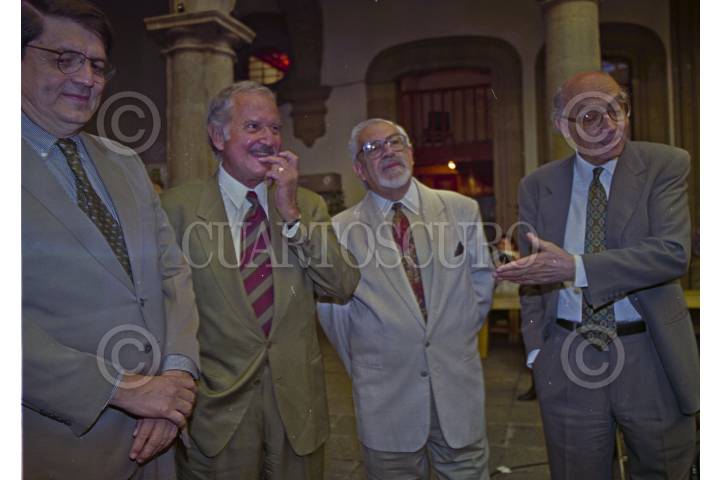 MÉXICO, D.F., 16MAYO2012.- El escritor Carlos fuentes fallecio el dia de hoy tras una complicacion respiratoria a la edad de 80 años en un hospital al sur de la ciudad. En la imagen tomada el 19 de marzo los escritores Sergio Ramirez, Carlos Fuentes y Jose Saramago durante la firma de un convenio de refugio internacional con escritores extranjeros. FOTO: VICTORIA VALTIERRA /ARCHIVO /CUARTOSCURO.COM