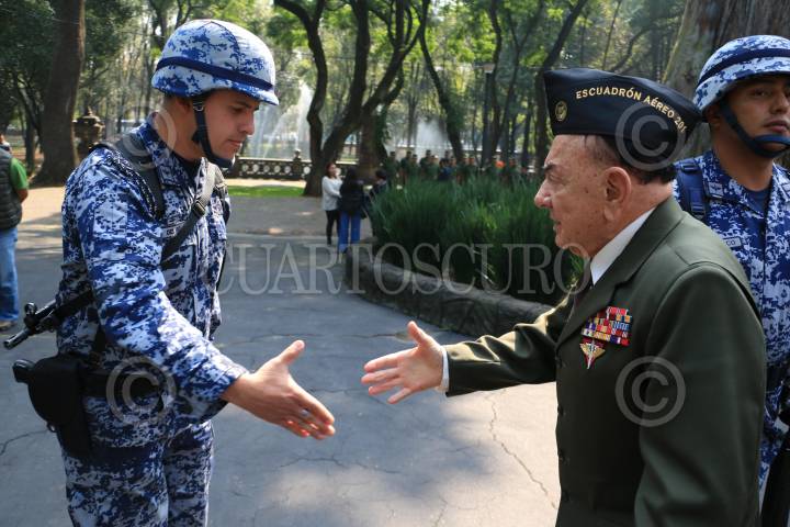 CIUDAD DE MÉXICO, 08MAYO2025.- Ceremonia póstuma en Honor al Sargento 1/o. de Transmisiones Retirado César Maximiliano Gutiérrez Marín, último integrante del "Escuadrón 201" unidad aérea mexicana que participó en la segunda guerra mundial. La ceremonia fue realizada en el monumento a la Fuerza Aérea Expedicionaria Mexicana ubicado en el Bosque de Chapultepec. FOTO: MARIO JASSO/CUARTOSCURO.COM