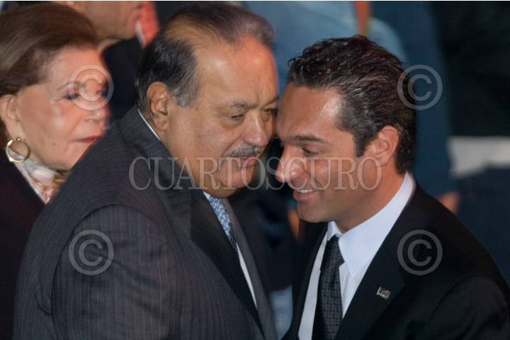 MÉXICO D.F.,09SEPTIEMBRE008.- El empresario Carlos Slim , saluda a su hijo Carlos Slim Domit, durante el desarollo de ¨México siglo XXI¨, evento organizado por fundacion telmex, donde cientos de becarios se dieron cita en el auditorio nacional, para escuchar ponencias de personajes nacionales e internacionales. FOTO: SÁSHENKA GUTIÉRREZ/CUARTOSCURO.COM