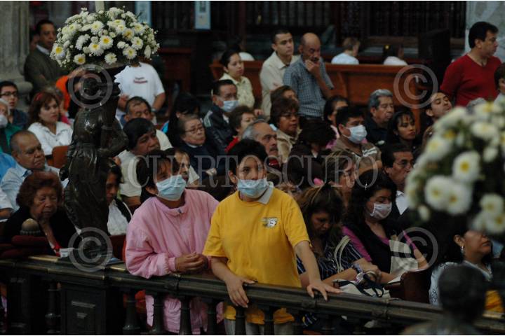 MÉXICO, D.F., 17MAYO2009.- Fieles acuden con cubre bocas a escuchar la misa dominical oficiada por el cardenal Norberto Rivera Carrera en la Catedral Metropolitana. FOTO: RODOLFO ANGULO/CUARTOSCURO.COM