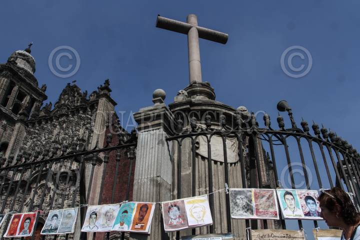 MÉXICO, D.F., 18NOVIEMBRE2015.- Ciudadanos cuelgan afuera de la Catedral Metropolitana, algunos retratos de los 43 desaparecidos de la Escuela Normal Rural de Ayotzinapa. Cada miércoles se reúnen para invitar al público en general a reflexionar en torno al Caso Ayotzinapa. FOTO: MARÍA JOSÉ MARTÍNEZ /CUARTOSCURO.COM