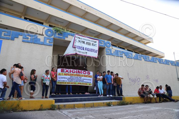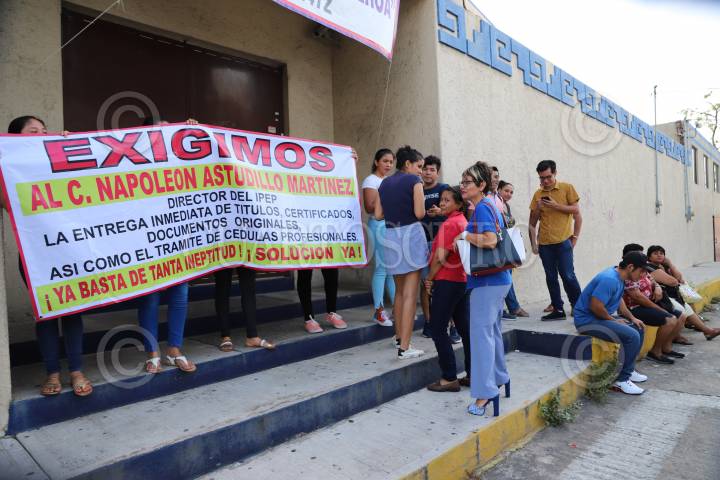 ACAPULCO, GUERRERO, 08OCTUBRE2019.- Ex alumnos defraudados por el Instituto Pedagógico de Estudios Profesionales (IPEP) y sus padres se manifestaron a las puertas del esta centro educativo esto en demanda de la entrega de sus documentos como son títulos, certificados y documentación personal que entregaron cuando ingresaron, muchos de ellos señalaron que en su momento pagaron cerca de 30 mil pesos cada uno para los trámites correspondientes hace ya casi 5 años, señalan que según lo que han podido investigar el trámite de la cédula no lo pueden hacer por que el director y dueño de esta institución privada, Napoleón Astudillo Martínez, no ha llevado los documentos correspondientes ante la SEP. FOTO: BERNANDINO HERNÁNDEZ /CUARTOSCURO.COM