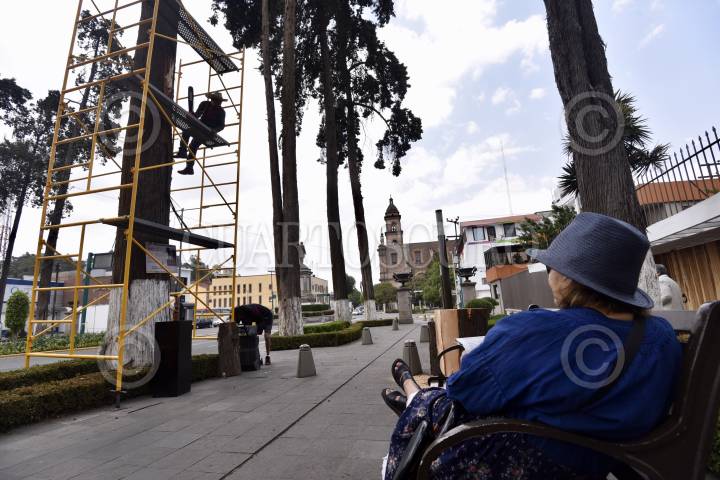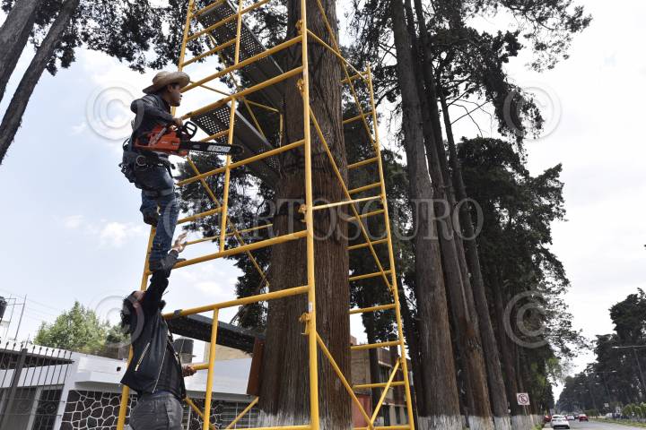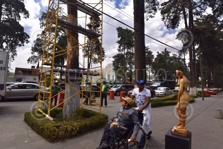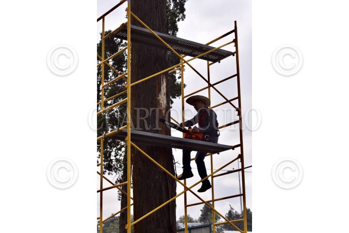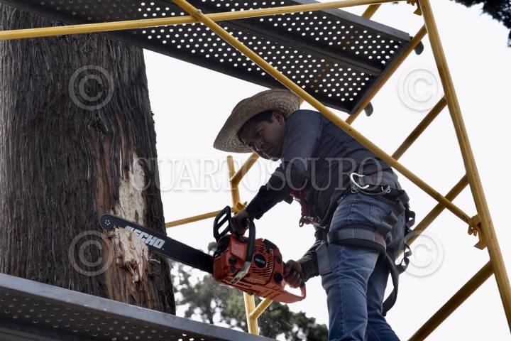 TOLUCA, ESTADO DE MÉXICO, 07ABRIL2019.- Los artistas Philip Zarkin, Jesús Nonato y Filiberto Jacales, participarán en el proyecto Tallando Vida, que consiste en convertir en esculturas los troncos de árboles que cumplieron su ciclo de vida en Paseo Colón, y para no derribarlos completamente, serán intervenidos por los artistas. FOTO: ARTEMIO GUERRA BAZ /CUARTOSCURO.COM
