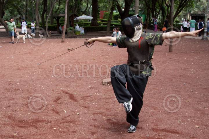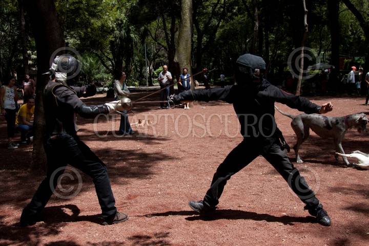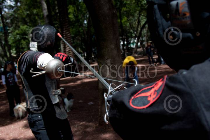 MÉXICO, D.F., 07AGOSTO2011.- Hombres recrean duelos del siglo XVI en el Parque México como parte de las actividades que realiza periódicamente la Asociación de Esgrima Histórica de la Ciudad de México. FOTO: IVÁN STEPHENS/CUARTOSCURO.COM