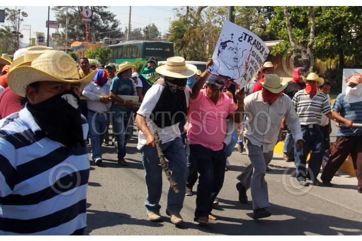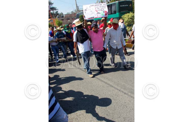 CHILPANCINGO, GUERRERO, 10ABRIL 2013.- Guillermo Galindo Gallegos, policía ministerial del municipio de Tlalpa, fue retenido por maestros disidentes de la Coordinadora Estatal de Trabajadores de la Educación del estado de Guerrero, amarrado y obligado a caminar descalzo más de cinco kilómetros del zócalo al plantón de los maestros ubicado en la colonia Jacarandás. Galindo Gallegos portaba una pistola nueve milímetros y fue acusado de ser un infiltrado del gobierno. FOTO: SAÚL LÓPEZ /CUARTOSCURO.COM