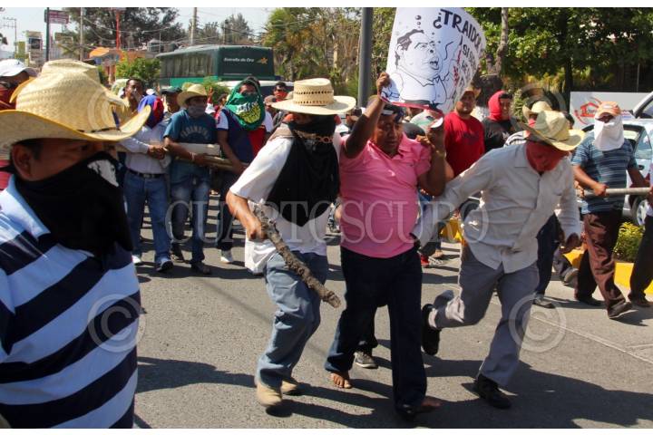 CHILPANCINGO, GUERRERO, 16OCTUBRE2014.- Profesores que estaban en su movilización en la caseta de palo blanco, retuvieron a dos personas del sexo masculino, y los presentaron en el zócalo de esta ciudad, ante un rpresentante del ministerio publico federal y el presidente d ela CODEHUM Ramon Navarrte Magdaleno, y se gun dijeron uno es militar y el otro quien sabe dijo un profesor. FOTO: JOSÉ I. HERNÁNDEZ /CUARTOSCURO.COM