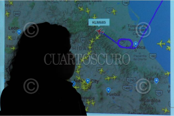 Un hombre toma imagen de una lámina sobre el rediseño del espacio aéreo en la capital.