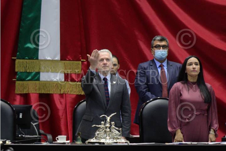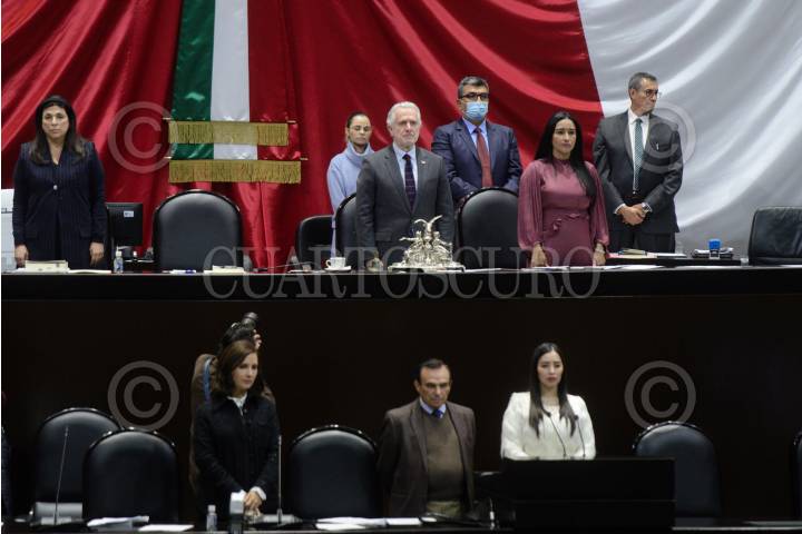 Santiago Creel, presidente de la mesa directiva, y legisladores, durante minuto de silencio en memoria a las víctimas del terremoto en Siria y Turquía.