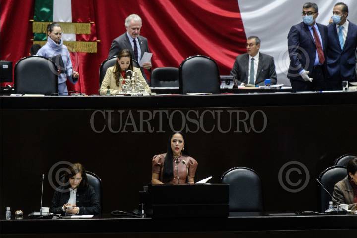 Juanita Guerra Mena, diputada de Morena y presidenta de la Comisión de Seguridad Ciudadana, durante su intervención para fundamentar el proyecto de Decreto por el que se expide la Ley de Protección del Espacio Aéreo Mexicano.