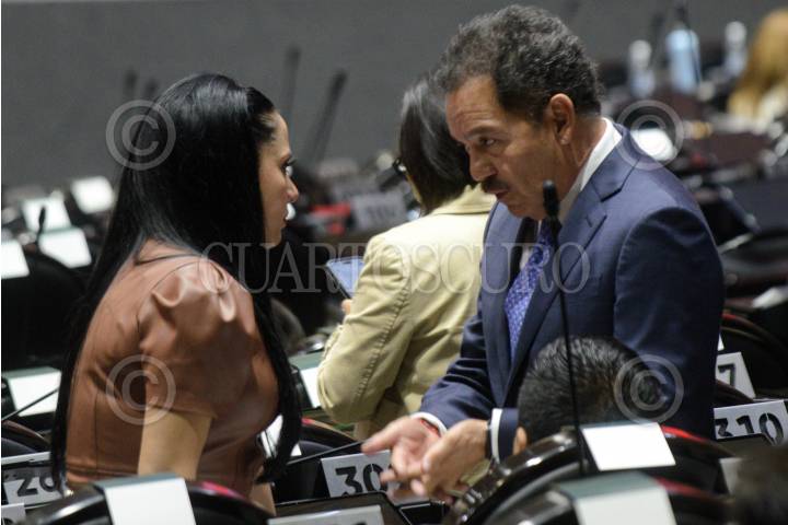 Juanita Guerra, diputada de Morena, habla con el coordinador Ignacio Mier, durante la sesión ordinaria de la Cámara de Diputados.