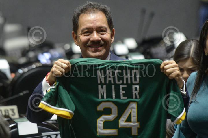 Ignacio Mier, diputado y coordinador de Morena, muestra un jersey del equipo de béisbol los "Cañeros" durante la sesión ordinaria de la Cámara de Diputados.
