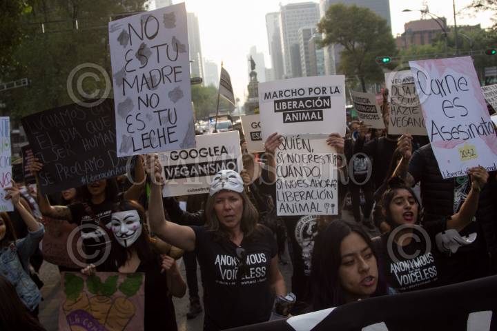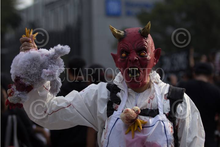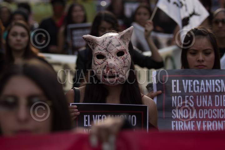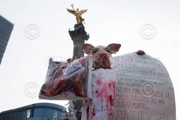 CIUDAD DE MÉXICO, 11NOVIEMBRE2023.- Organizaciones sociales en defensa de los derechos animales y contra el especismo se manifestaron del Ángel de la Independencia al Zócalo capitalino. Con pancartas, personificados como animales y una batucada las y los asistentes expresaron que la solución es el veganismo y que la empatía abarque a todas las especies animales y no sólo a los que son domésticos. FOTO: GALO CAÑAS/CUARTOSCURO.COM