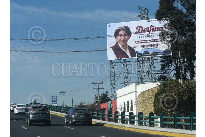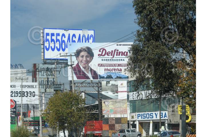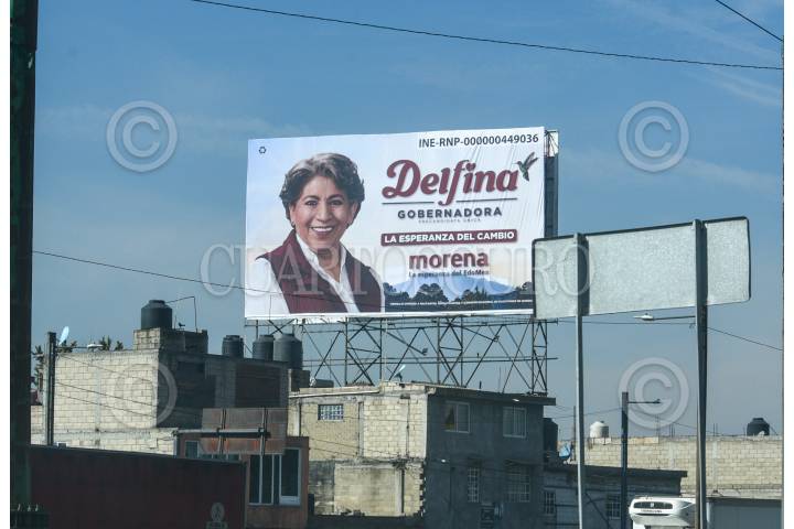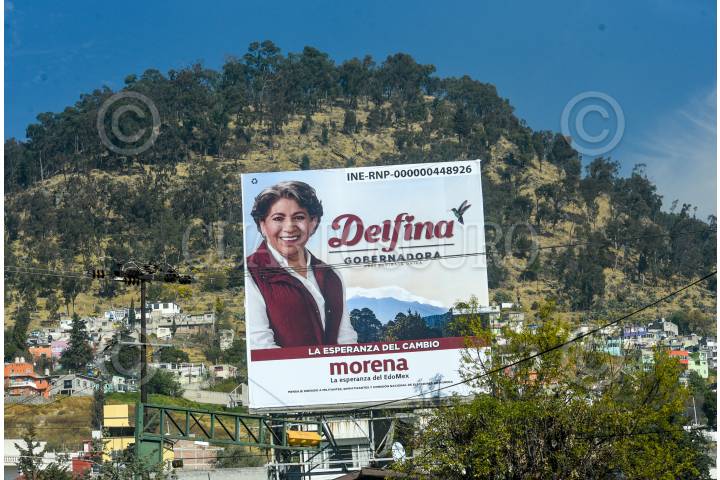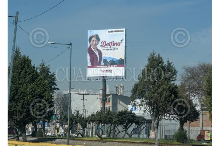 Espectaculares de Delfina Gómez precandidata única de MORENA a la gubernatura del Estado de México en diversos puntos del Valle de Toluca.
