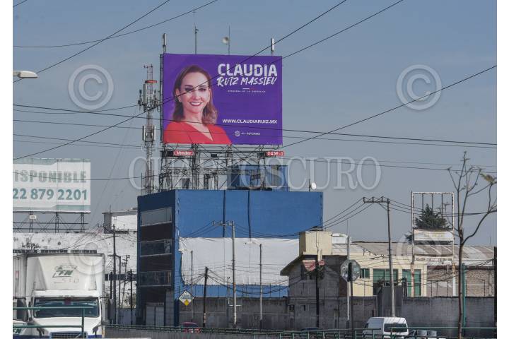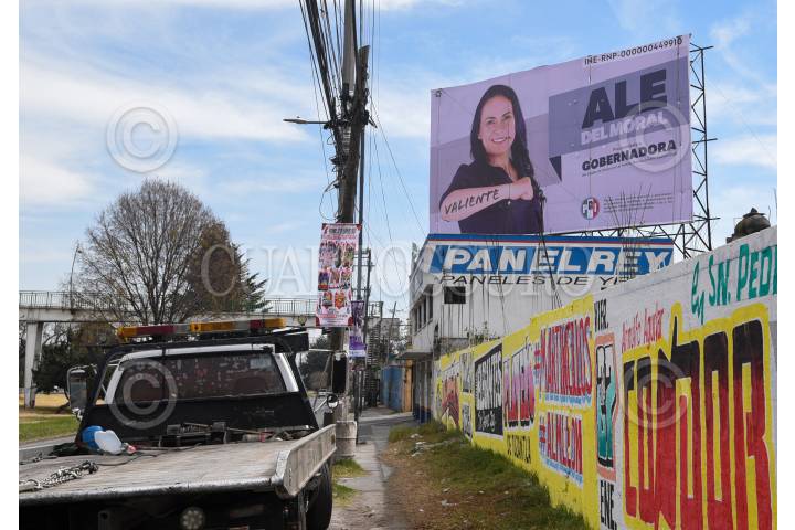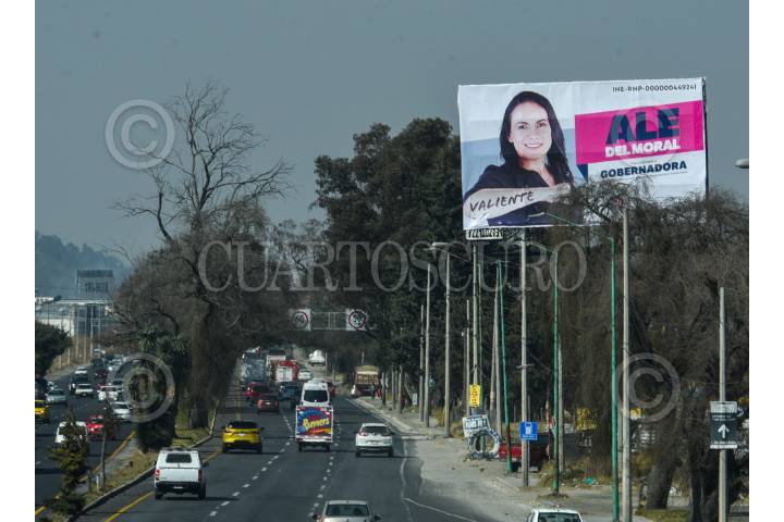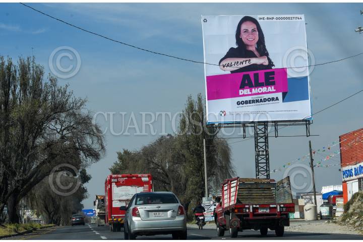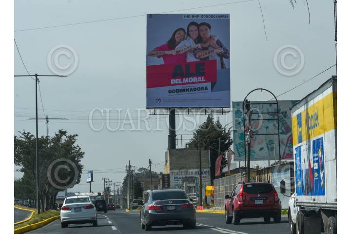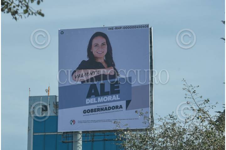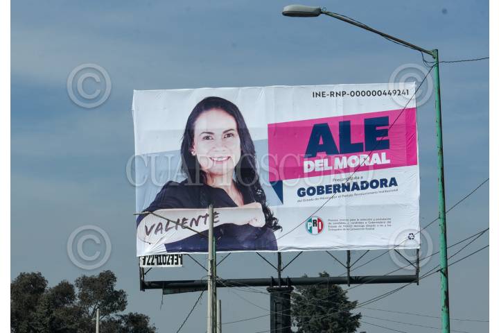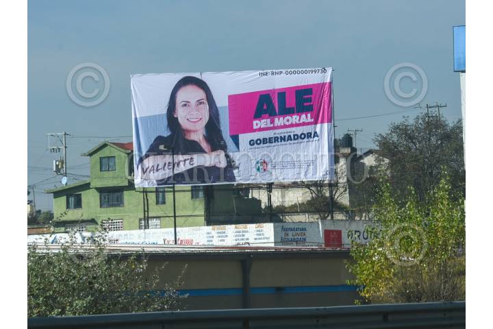 Aspectos de espectaculares de Alejandra del Moral precandidata del PRI a la gubernatura del Estado de México.