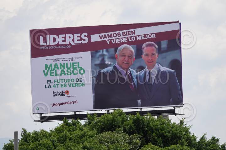 Manuel Velasco, candidato a la presidencia por Morena, promociona a través de un espectacular una entrevista en la plataforma de Amazon con el tema de la 4T