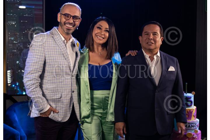 Los conductores de Primera mano Gustavo Adolfo Infante, Addis Tuñón durante conferencia de prensa por los 5 años del programa al aire.