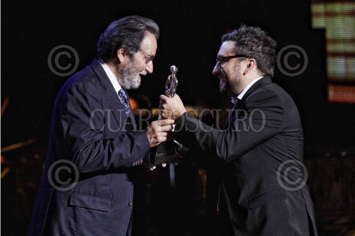 MÉXICO, D.F., 27MAYO2015.- Alfonso Ruizpalacio recibió el Ariel a Mejor Director de manos de Jorge Fons, durante la ceremonia de la 57 Entrega del Ariel a lo más destacado de la cinematografía nacional. FOTO: ISAAC ESQUIVEL /CUARTOSCURO.COM