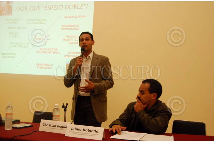 ZACATECAS, ZACATECAS, 27SEPTIEMBRE2008.- Christian Begue; director de la Alianza Francesa de Zacatecas y Jaime Robledo Martínez, Historiador de la Fototeca de Zacatecas, quienes hablaron en nombre del fotografo David Beker, explicaron la motivación del trabajo fotográfico que se presentó en la exposición; "Melanesia Espejo Doble", en donde se retrata el choque brutal de 2 culturas, la ancestral con sus costumbres; la cultura que vive al día en armonia con la naturaleza y la moderna que explota la naturaleza con los adelantos tecnológicos del Siglo XXI. FOTO: CARLOS SEGURA/CUARTOSCURO.COM