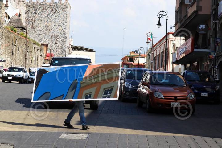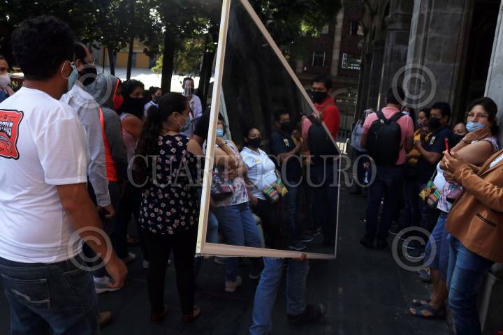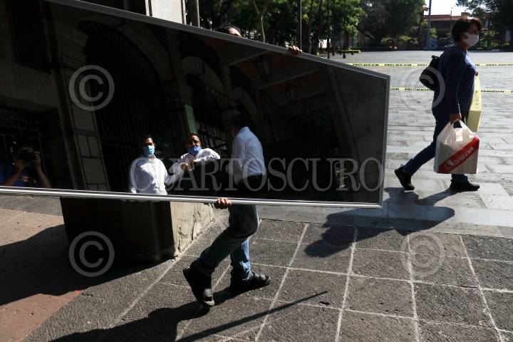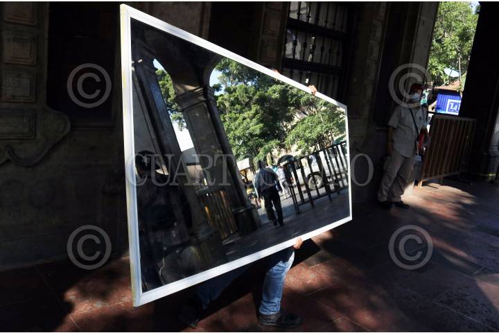 Un hombre camina por el centro de Cuernavaca cargando un enorme espejo donde se reflejan diversas realidades.