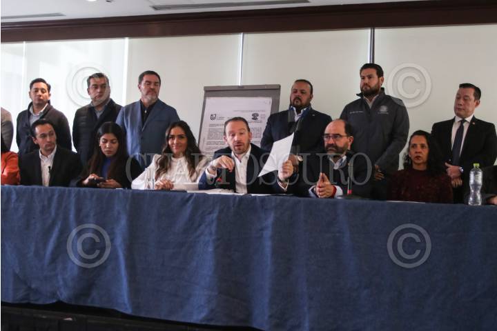 CIUDAD DE MÉXICO, 12DICIEMBRE2023.- Santiago Taboada, Santiago Creel, Lía Limón, Emilio Álvarez Icaza, Alessandra Rojo de la Vega durante conferencia de prensa donde presentan supuestas pruebas sobre espionaje por parte del gobierno. FOTO: ANDREA MURCIA /CUARTOSCURO.COM