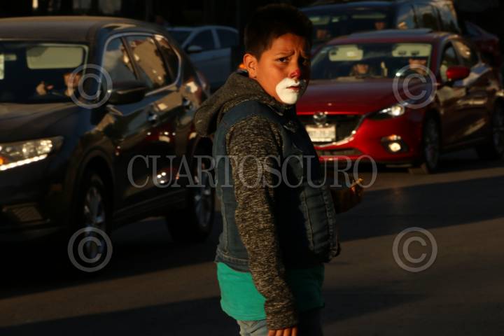 CIUDAD DE MÉXICO, 18FEBRERO2019.- Niño con el rostro pintado de payaso, trabaja vendiendo dulces y haciendo malabares, para los automovilistas en el cruce de Paseo de la Reforma e Insurgentes. FOTO: ROGELIO MORALES /CUARTOSCURO.COM
