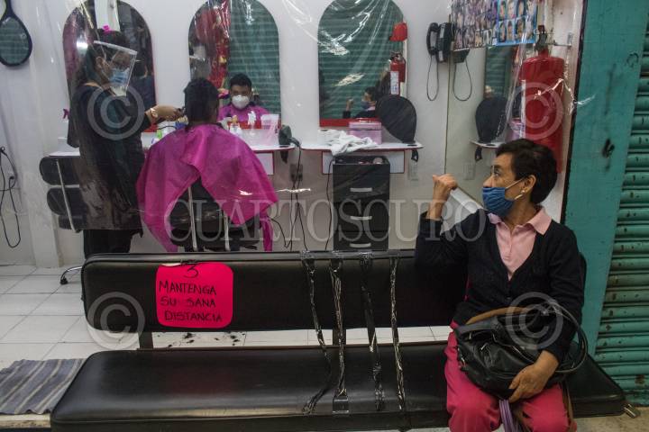Una mujer espera su turno en una estética, la cual invita a sus clientes a la sana distancia.