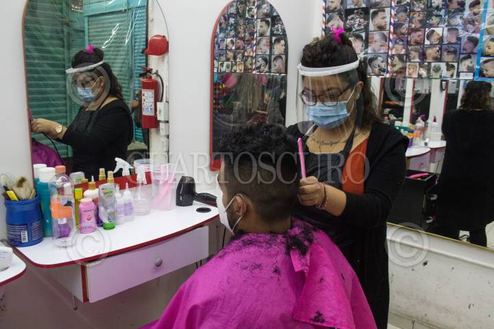 Un estilista atiende a un cliente con careta y cubrebocas.