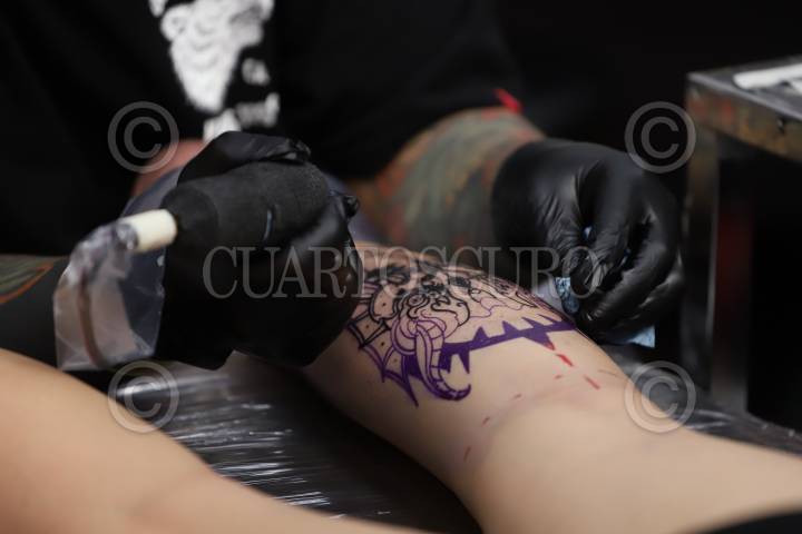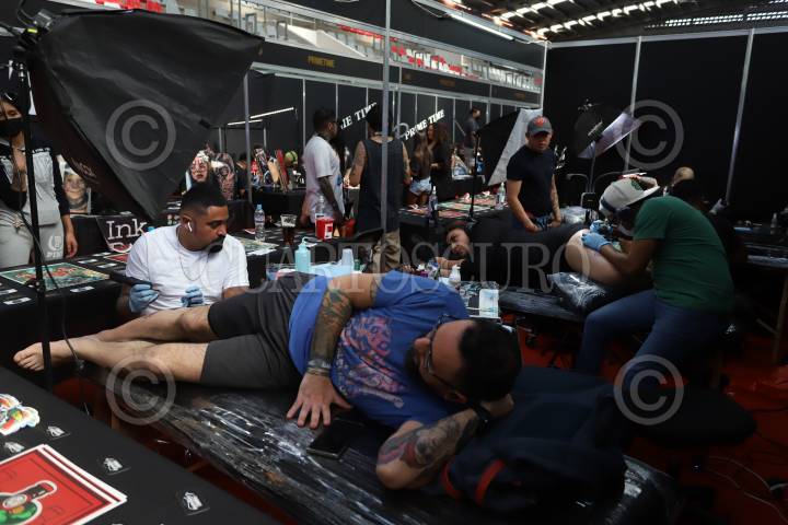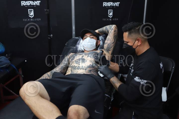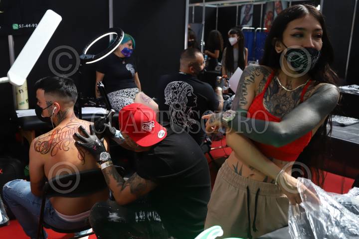 aspectos del trabajo de tatuaje durante la expo Tattoarte 2021 en la sala de Armas de Ciudad Deportiva en Iztacalco