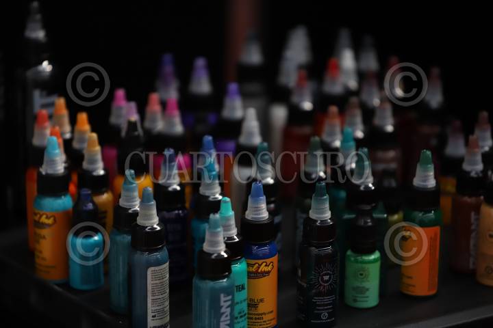 Aspectos de las tintas que artistas del tatuaje utilizan durante la expo Tattoarte 2021 en la sala de Armas de Ciudad Deportiva en Iztacalco