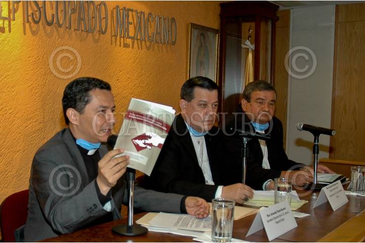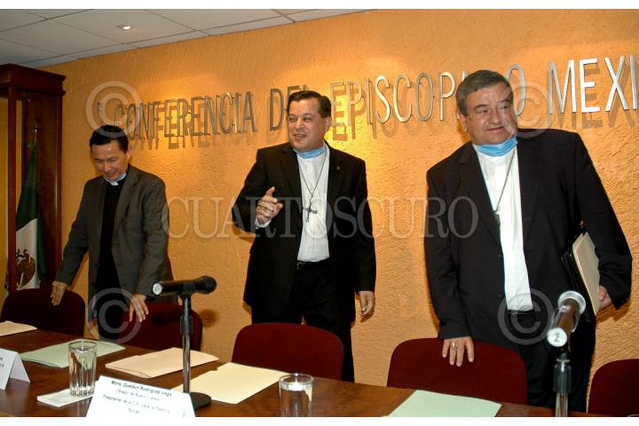 MÉXICO, D.F., 13MAYO2009.- Armando Flores, secretario ejecutivo para la Pastoral Social; Gustavo Rodriguez, obispo de Nuevo Laredo y Carlos Garfias, obispo de Cd. Neza durante una conferencia de prensa en donde los obispos de México hacen público el mensaje "No hay Democracia verdadera y estable sin participación ciudadana y justicia social" que va dirigido a los fieles católicos ante las próximas elecciones federales. FOTO: RODOLFO ANGULO/CUARTOSCURO.COM