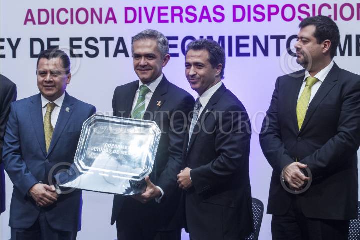 MÉXICO, D.F., 08JUNIO2015.- Miguel Ángel Mancera, jefe de Gobierno del Distrito Federal, recibió un reconocimiento de parte de José Luis Beato, presidente de la Coparmex-D.F., durante la Promulgación del Decreto por el que se derogan, reforman y adicionan diversas disposiciones de la Ley de Establecimientos Mercantiles del D.F. FOTO: ISAAC ESQUIVEL /CUARTOSCURO.COM